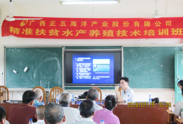 7月15日,農(nóng)業(yè)產(chǎn)業(yè)化重點龍頭企業(yè)正五海產(chǎn)公司聯(lián)合市農(nóng)業(yè)局和水產(chǎn)畜牧獸醫(yī)局,來到銀海區(qū)四條貧困村之一的福成鎮(zhèn)大坎村舉辦“精準扶貧水產(chǎn)養(yǎng)殖技術培訓班”。來自大坎村委的貧困戶及水產(chǎn)養(yǎng)殖戶踴躍參加了培訓。
