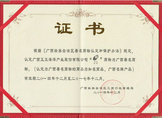 經廣西著名商標評審委員會評審確認,廣西壯族自治區工商局同意,正五海產公司注冊商標“ZHENCWU正五”被認定為廣西著名商標,并于日前獲得了自治區工商局頒發的廣西著名商標證書。