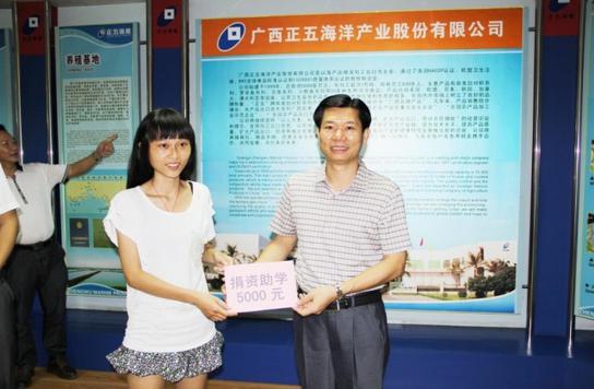 2013829日上午,北海市銀海區委宣傳部、區團委、建設局,銀灘鎮黨委、社會保障服務中心、鎮團委在正五公司為家住銀灘鎮北背嶺村的高考生林慶真舉行了一場簡潔而隆重的捐資助學儀式。董事長黃禮雄代表正五公司向林慶真捐款5000元,銀灘鎮各界也向林慶真捐款5000元。