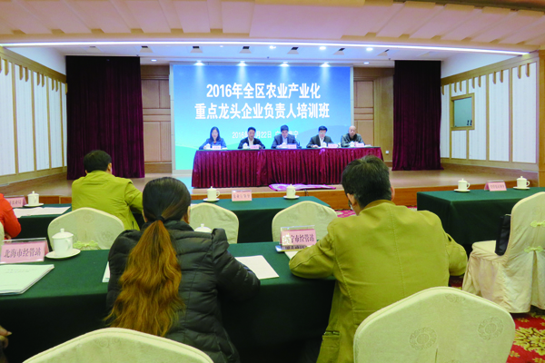 2016年度全區農業產業化重點龍頭企業培訓班于12月22日在南寧舉辦,正五海產與廣西中糧、常樂蠶絲、利添科技等8家北海本土企業與全區其他市農業局(農委)分管領導、農業產業化辦公室負責人以及自治區農業產業化重點龍頭企業代表共130多人參加培訓。旨在認真貫徹落實自治區黨委、政府的決策部署,交流學習龍頭企業在參與示范區創建、產業扶貧、企業創新管理以及文化建設等方面的主要經驗和做法,